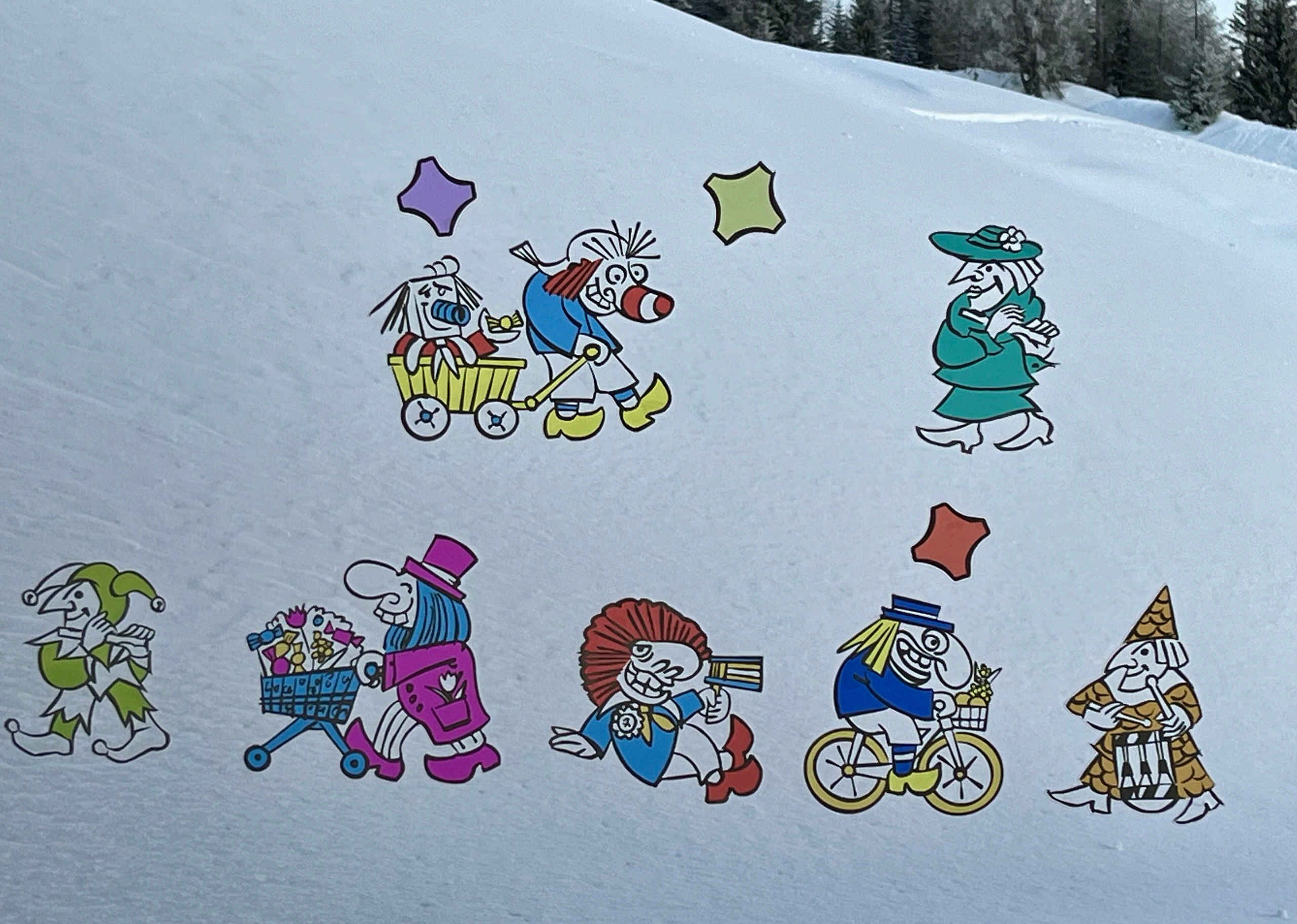 Die Figuren 2025 stehen ganz im Zeichen der Guggemusik. Fabian Fischlin hat 7 tolle und stilvolle Figuren entworfen, die zusammen ein farbenfrohes Guggi-Zügli ergeben. Die Figuren lassen sich auch wunderbar mit den Figuren der letzten Jahre zu einem bunten Fasnachtsfänschter kombinieren.