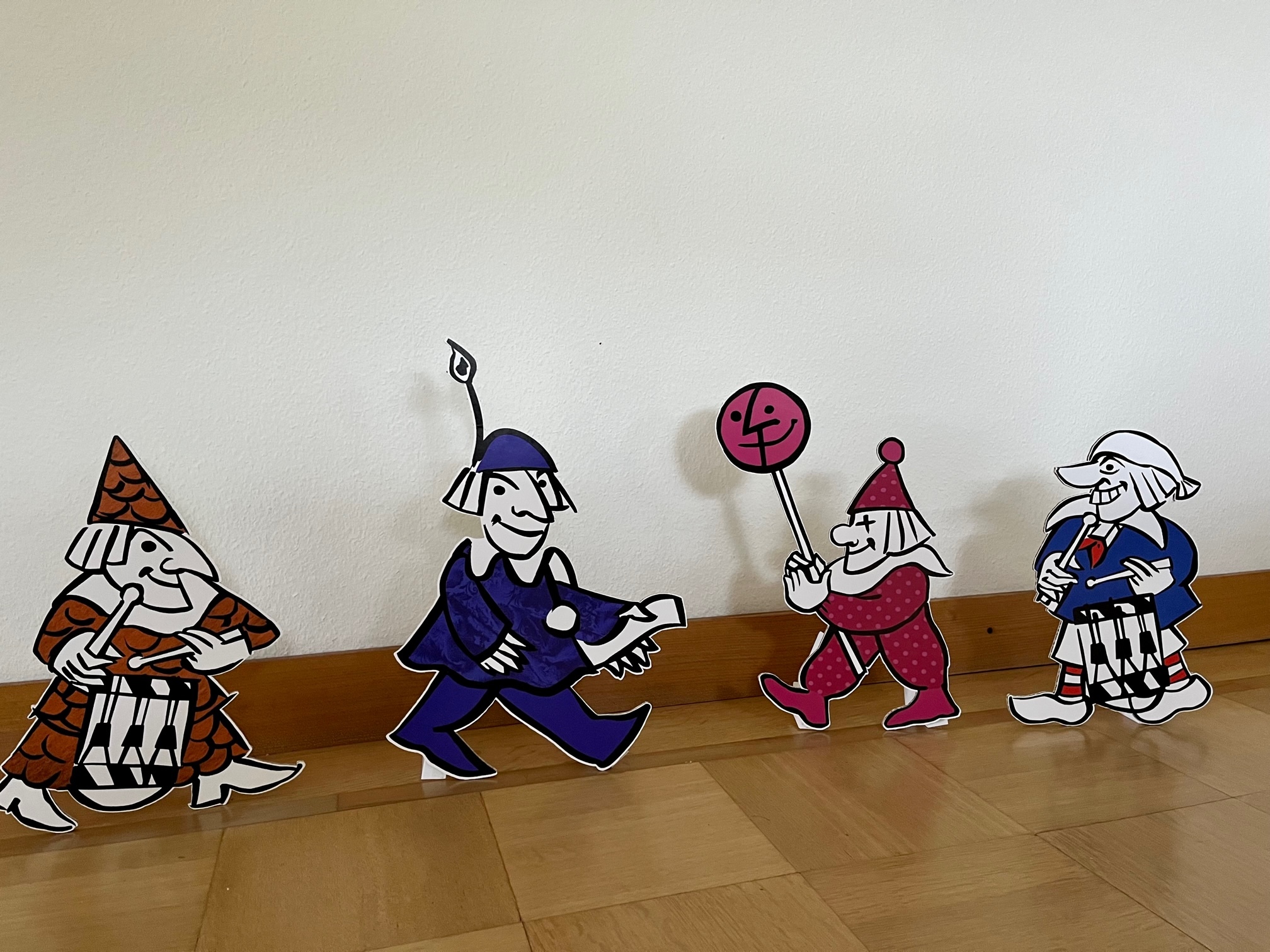 Fasnachtsfaenschter.ch bietet alle Figuren auch als Aufsteller für Innenräume an. Die 40 Zentimeter hohen Aufsteller sind aus fünf Millimeter dicken Kartonwabenplatten hergestellt und können entweder als komplettes Fasnachtsziigli oder einzeln bestellt werden. Mit diesen Aufstellern sorgst du bei deinen Besucher*innen garantiert für riesengrosse Fasnachtsvorfreude!